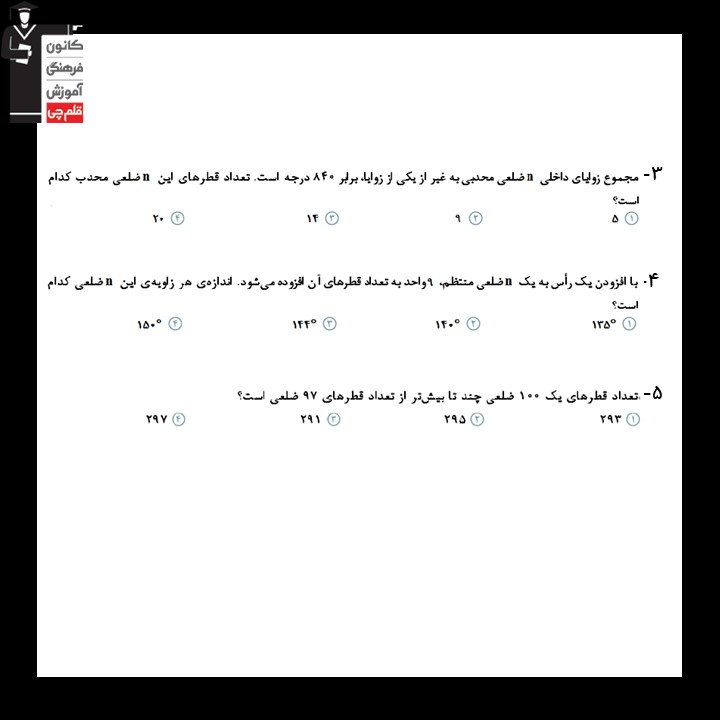 دوستان خوب دهمی سلامدر این آزمونک 5 سوال هندسه دهم (به همراه پاسخ) از مبحث چندضلعی ها، توسط فاطمه احدزاده رتبه 373 رشته ریاضی سال 95 آماده و برای شما قرار داده شده است. برای حل سوالات بیشتر، حتما تستهای کتاب آبی و سه سطحی ریاضی دهم را تمرین کنید.