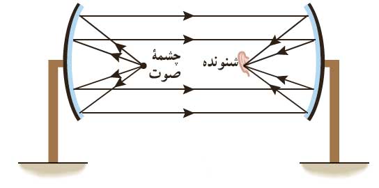امواج صوتی مانند سایر امواج می توانند از سطوح خمیده بازتاب شوند. در شکل زیر دو سطح کاو دیده می شود. وقتی شخصی در کانون یکی از این سطوح صحبت می کند، شخص دیگری در کانون سطح کاو دیگر قرار دارد، صدای او را می شنود.