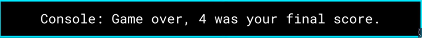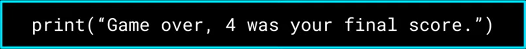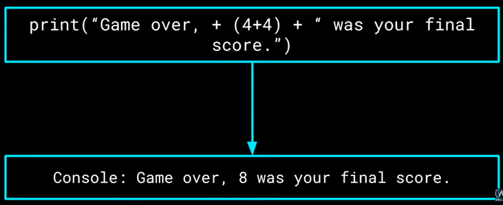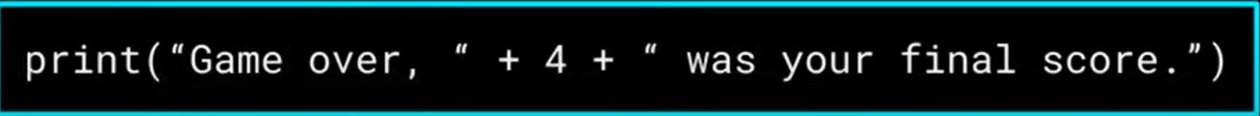 در این مثال از استایل پایتون استفاده کردیم. ما دوباره رشتهمون رو با print شروع کردیم که میتونه تو زبانهای دیگه متفاوت باشه. داخل پرانتز اول رشتهی game over رو مینویسیم. بعد میرسیم به بخش مهم. ما اول یه علامت بعلاوه میذاریم و سپس عدد 4 رو اضافه میکنیم. سپس همین فرایند رو تکرار میکنیم. یعنی یه بعلاوه میذاریم و یه رشته دیگه بعدش میاریم. بعد از این عملیات ما به راحتی میتونیم کل جملهمون رو در پیشخوان مشاهده کنیم.
