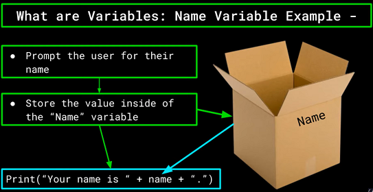 بچههای عزیز تو این بخش حواستون رو بیشتر جمع کنید که بخش مهمی تو حوزه برنامهنویسی است. متغیر چیزیه که میتونه اطلاعات رو ذخیره بکنه که متونیم بهشون ارجاع بدیم و حتی تغییرشون بدیم. فرض کنید متغیرها جعبههای مقوایی هستند. ما جعبههای مقوایی رو به این منظور استفاده میکنیم که اقلاممون رو توش نگهداری کنیم. همچنین ما میتونیم محتویات این جعبه رو تغییر بدیم یا جایگزین بکنیم. حالا متغیرها جعبههای مقوایی برنامهنویسها هستن که اطلاعاتشون رو تو اون نگهداری میکنن تا بتونن بعدا از اون اطلاعات استفاده کنن.