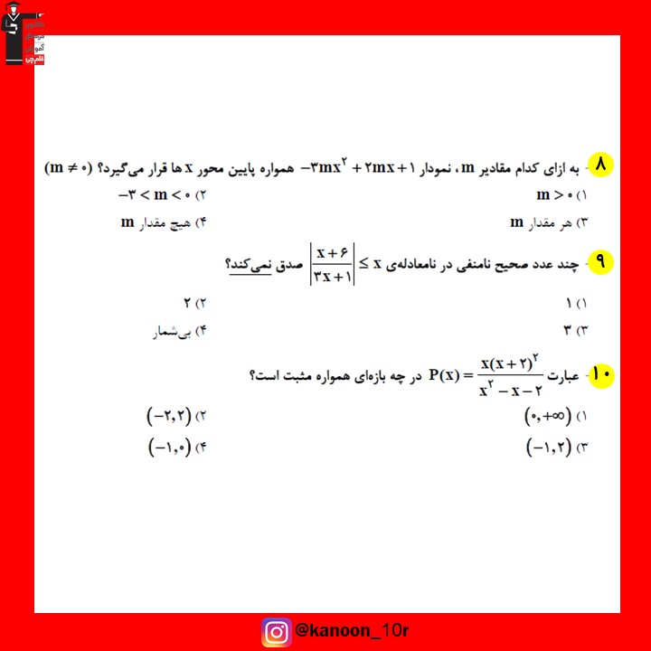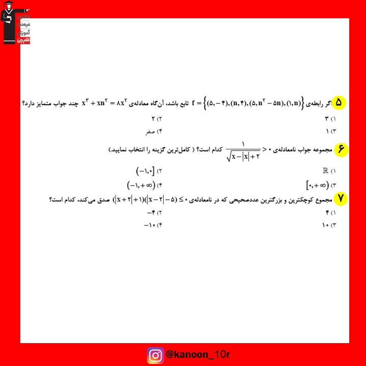 10 سوال ریاضی دهم که در ادامه برای شما قرار دادیم، جمع بندی مباحث آزمون 5 اسفند بوده و برای آمادگی بیشتر شما در این آزمون توسط فاطمه احدزاده رتبه 373 رشته ریاضی سال 95 انتخاب و برای شما قرار داده شده است. بعد از مطالعه ی کتاب درسی و درسنامه های آمادگی آزمون 5 اسفند، توصیه میکنم حتما این سوالات را حل کرده و جواب های خود را با پاسخنامه بررسی کنید.