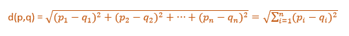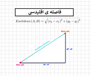 حالا، برای محاسبه فاصله این دو بردار، اونها رو یک نقطه در نظر میگیریم و سپس به استفاده از قضیه فاصله اقلیدسی، فاصله این دو نقطه رو به شرح زیر حساب می کنیم :