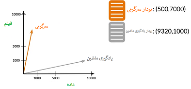 اگر خاطرتون باشه، در هفته قبل در مثالی، نزدیکی موضوعات سرگرمی، اقتصاد و یادگیری ماشین را با مبنا قرار دادن تکرار کلمات داده و فیلم مورد بررسی قرار دادیم و به سه بردار رسیدیم . حالا این هفته قصد داریم به وسیله فاصله اقلیدسی، فاصله این بردار ها رو به دست بیاریم و این فاصله رو مبنایی برای نزدیکی یا دوری مفاهیم از همدیگر تعریف کنیم . به عبارت دیگر، در این مدل سازی می خواهیم برای ماشین تعریف کنیم که هر موضوعی فاصله کمتری با موضوع دیگر دارد، به همدیگر نزدیک تر است . دو بردار سرگرمی و یادگیری ماشین را از مثال هفته قبل در نظر بگیرید:
