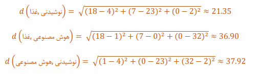 بنابراین، هر ردیف جدول را یک نقطه در میدان مختصات سه بعدی تصور کرده و فاصله آن ها را با همدیگر بدست می آوریم :