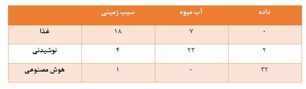 بنابراین برای تعریف میزان نزدیکی دو مفهوم در ماشین، نیازی به رسم بردار نیست و فقط باید تعداد تکرار کلیدواژه های مبنا رو در اون موضوعات پیدا کنیم و سپس با استفاده از فرمول فاصله اقلیدسی که برای ماشین تعریف کرده ایم، میزان فاصله دو مفهوم رو برای ماشین مدل سازی کنیم؛ چون ماشین زبان اعداد و ریاضیات رو میفهمه نه زبان ما رو . به همین خاطر، ما از قضایای ریاضی استفاده میکنیم تا زبان خودمون رو برای ماشین مدل سازی کنیم . به یک مثال دیگه از این مدل سازی توجه کنید : فرض کنیم می خواهیم برای ماشین، سه موضوع (( غذا )) ، (( نوشیدنی )) و (( هوش مصنوعی)) را با مبنا قرار دادن تکرار کلمات ((سیب زمینی)) ، (( آب میوه )) و (( داده)) بررسی کنیم. تعداد تکرار هر کلیدواژه را در مقالات سه موضوع ذکر شده بررسی کرده ایم که جدول زیر به دست آمده است :