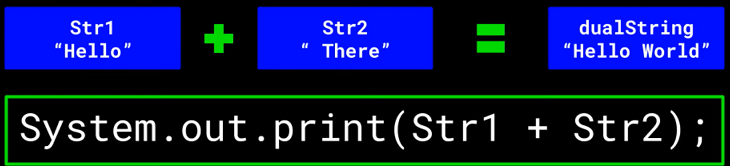 فرض کنید ما رشتهای به نام Str1 داریم که محتواش Hello است. رشتهی دیگهای به نام Str2 داریم که محتواش There است. شما میتونید Str1 رو به Str2 اضافه بکنید تا نتیجهای با محتوای Hello There به دست بیارید. همچنین میتونید اون رو به عنوان یک متغیر سوم ذخیره کنید یا در کنسول پرینت کنید.
