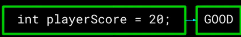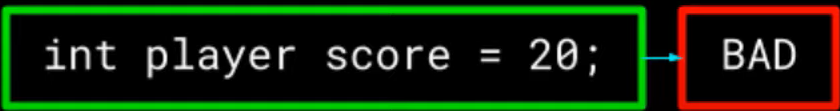 متغیرها باید یک رشته پیوسته باشند. اگه بخوایید متغیری ایجاد کنید که امتیاز (Score) یک پلیر (Player) رو ذخیره کنه، مجبورید یه راهی پیدا کنید تا کلمات Player و Score رو ترکیب کنه. چرا که نمیتونید جمله Player Score رو به عنوان اسم یک متغیر داشته باشید.