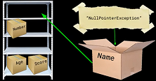 برگردیم به مثال جعبه مقوایی که قبلاً دربارهش حرف زدیم. فرض کنید شما یک قفسه دارید و یک جعبه مقوایی جدیدی ایجاد میکنید که لیبل (Label) نام روش میزنید. توی این جعبه یه کاغذ قرار میدید که روش نوشته شده NullPointerException.
