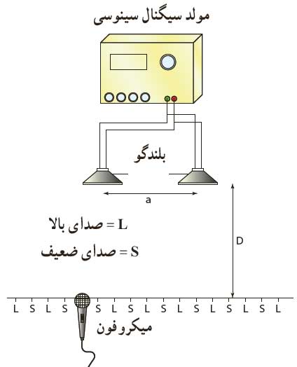 امواج صوتی نیز می توانند تداخل کنند. آزمایشی را در نظر بگیرید که در آن دو بلندگو که به یک مولد سیگنال الکتریکی متصل اند، امواج سینوسی هم بسامدی را در فضا منتشر می کنند. با حرکت دادن میکروفون در امتداد خط فرضی نشان داده شده در شکل که در فاصله مناسبی از بلندگوها قرار دارد، مشاهده می شود که بلندی صدا به طور متناوب کم و زیاد می شود.