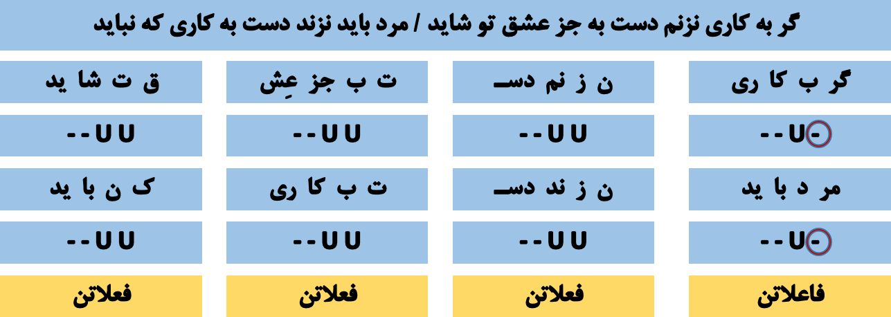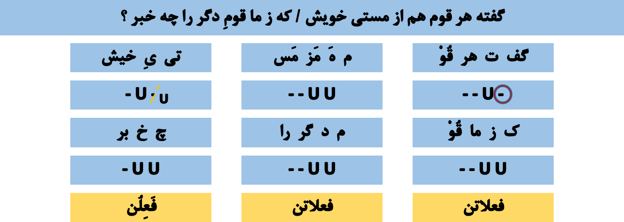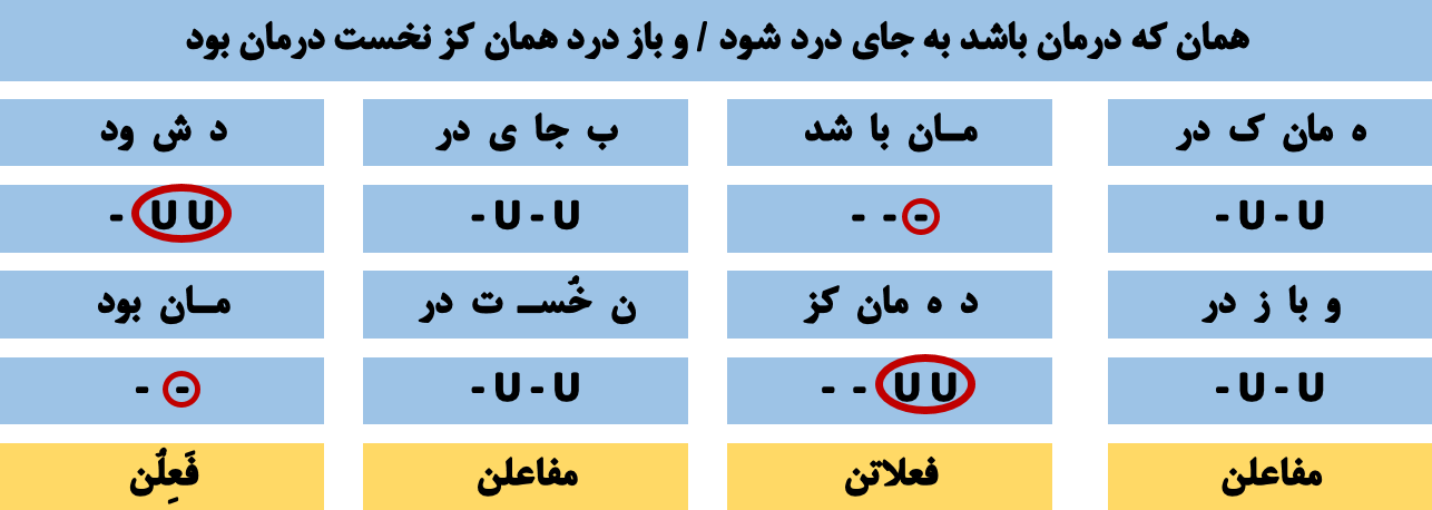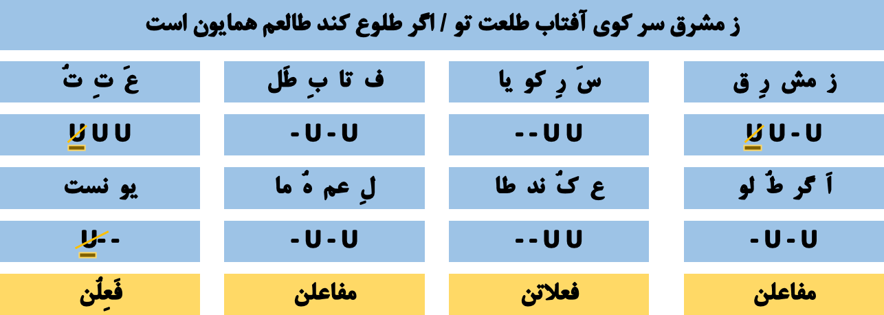 🔵 هجای پایانی مصراع ها ، از هر نوعی که باشد ، همیشه بلند به حساب آمده و با علامت (( - )) نمایش داده میشود . 🔵