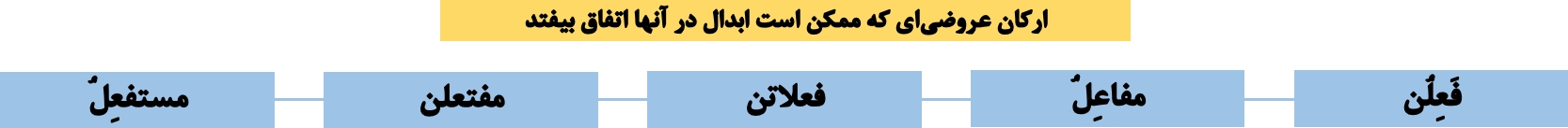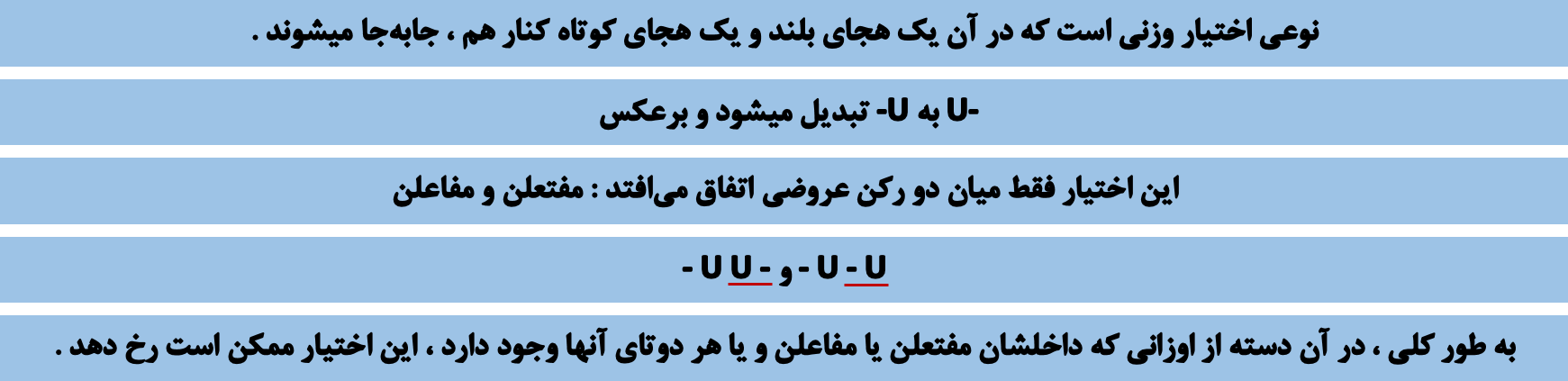🔵 در هر رکن عروضیای که دو هجای کوتاه کنار هم قرار داشته باشند ، این اختیار میتواند اعمال شود . 🔵