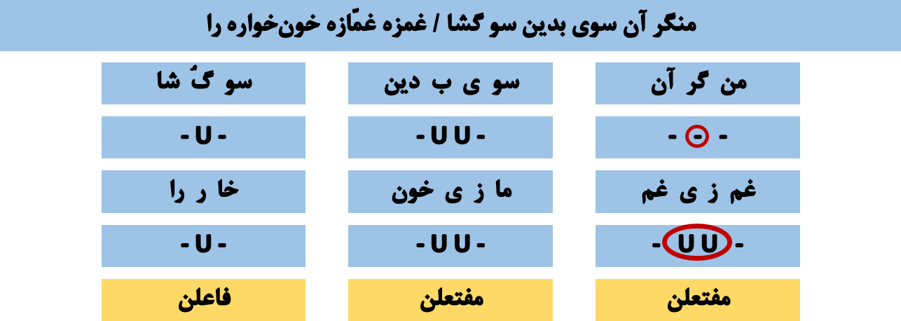 🔵 در جایی که باید مفاعلن میآمده ، مفتعلن آمده است . 🔵