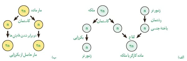 *ملکه، زنبور ماده ای می باشد که با میوز خود دو گامت هاپلوئید ایجاد می کند.