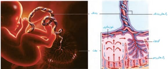*در بندناف، دو سرخرگ کوچک با خون تیره،موادغذایی کم و مواد زائد زیاد و یک سیاهرگ با خون روشن،اندوخته غذایی زیاد و مواد زائد کم می باشد.