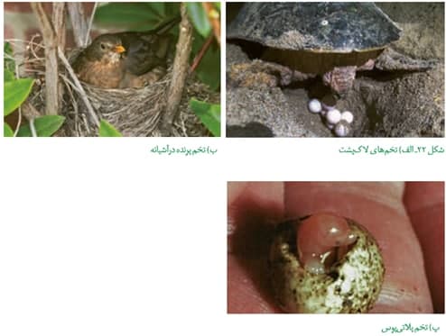 *در جانوران تخم گذار، پوسته ضخیم اطراف تخم از جنین محافظت می کند.