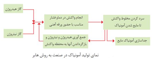 هابر واكنش میان گازهای هیدروژن و نیتروژن را بارها در دماها و فشارهای گوناگون انجام داد تا بتواند شرایط بهینه آن را پیدا كند. سرانجام دریافت که اگر مخلوط این گازها از روی یك ورقه ی آهنی (کاتالیزگر) در دما و فشار مناسب عبور داده شود با انجام واكنش، مقدار قابل توجهی آمونیاك تولید می شود؛ اما همه ی واكنش دهنده ها به فرآورده تبدیل نخواهد شد؛ زیرا این واكنش برگشت پذیر است؛ با این توصیف در ظرف واكنش مخلوطی از سه گاز هیدروژن، نیتروژن و آمونیاك وجود دارد.