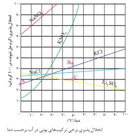 نکته: در این نمودار، نقاط روی منحنی نشان دهنده محلول سیر شده، نقاط زیر منحنی نشان دهنده محلول سیر نشده و نقاط بالای منحنی نشان دهنده محلول فراسیر شده است.