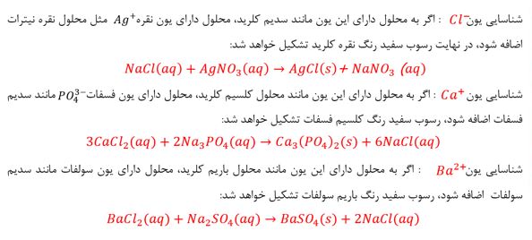 است. برخی از یون ها به طور طبیعی در آب حل شده اند و برخی دیگر مانند یون فلوئورید، در مراکز تأمین آب آشامیدنی سالم، به آب افزوده می شوند. وجود مقدار بسیار کم یون فلوئورید در آب آشامیدنی باعث حفظ سلامت دندان ها می شود و آب باران در هوای پاک تقریبا خالص است؛ زیرا هنگام تشکیل برف و باران، تقریبا همه مواد حل شده در آب، از آن جدا می شوند. این فرایند الگویی برای تهیه آب خالص است که به آن فرایند «تقطیر» و فراورده حاصل از آن را «آب مقطر» می گویند. و یکی از روش های شناسایی یون ها در آب یا محلول حاوی این یون ها، اضافه کردن محلول یک ترکیب یونی دیگر به آنهاست؛ به طوری که با یون موردنظر ما رسوب (ماده نامحلول) تشکیل دهد.