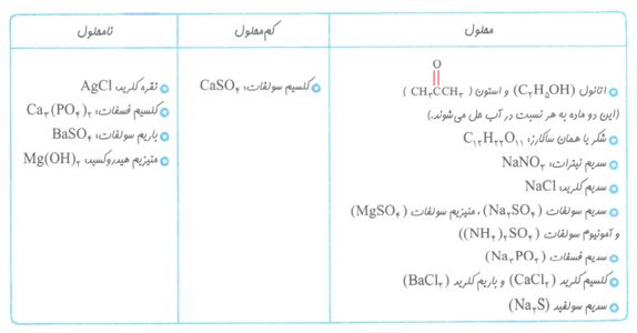 2- مواد نامحلول: موادی هستند که انحلال پذیری آن ها در دمای معین کم تر از 0/01 گرم در 100 گرم آب باشد. مانند کلسیم فسفات، نقره کلرید و باریم سولفات.