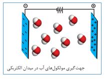 نحوۀ جهت گیری مولکول های آب در میدان الکتریکی نشان میدهد که اتم اکسیژن، سرِ منفی و اتمهای هیدروژن، سرِ مثبت مولکول را تشکیل می دهند. شیمیدان ها به مولکول هایی مانند آب که در میدان الکتریکی جهت گیری می کنند، مولکول های دوقطبی یا قطبی می گویند.