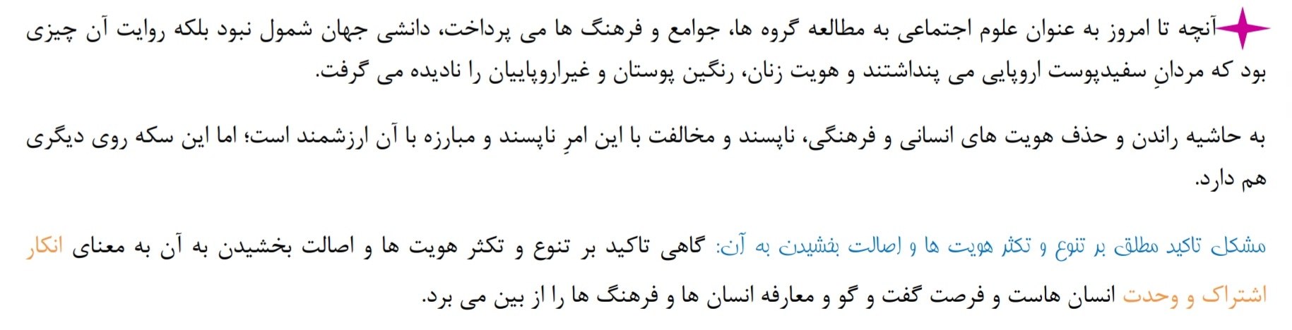 3) تاکید بر تنوع و تکثر هویت ها و اصالت بخشیدن به آن به معنای انکار اشتراک و وحدت انسان هاست و فرصت گفت و گو و معارضه انسان ها و فرهنگ ها را از بین می برد.