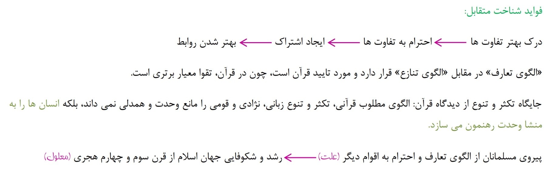 4) تکثر و تنوع زبانی، نژادی، قومی، مانع وحدت و همدلی نیست و انسان ها را به وحدت و همبستگی رهنمون می سازد و برای شناخت افراد از یکدیگر زمینه سازی می کند.