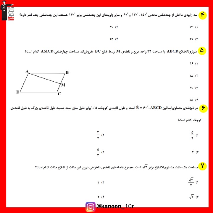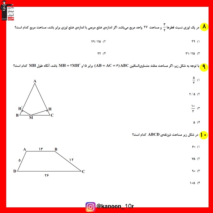 10 سوال هندسه دهم که در ادامه برای شما قرار دادیم، جمع بندی مباحث آزمون 19 اسفند بوده و برای آمادگی بیشتر شما در این آزمون توسط فاطمه احدزاده رتبه 373 رشته ریاضی سال 95 انتخاب و برای شما قرار داده شده است. بعد از مطالعه ی کتاب درسی و درسنامه های آمادگی آزمون 19 اسفند، توصیه میکنم حتما این سوالات را حل کرده و جواب های خود را با پاسخنامه بررسی کنید.