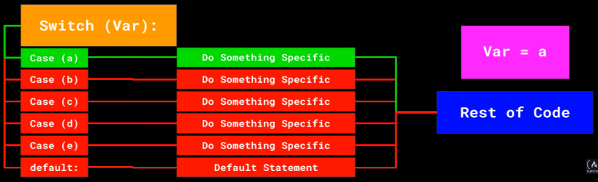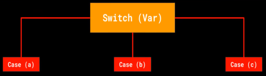 فرض کنید یک Switch (Var) یعنی یک متغیر Switch بخواییم بنویسیم. زیر این متغیر 5 کیس (Case) تعریف میکنیم که میتونه هر یک از اینها باشه. هر یک از دستورات جلوی کیسها میتونه اجرا بشه به شرطی که متغیر ما با اون کیس خاص برابر باشه.