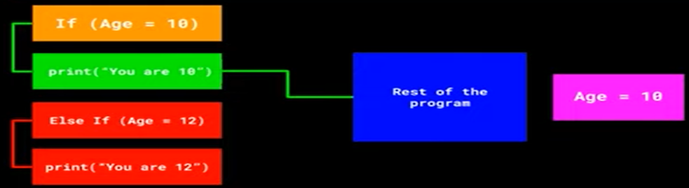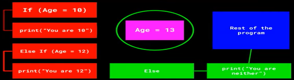 خب اگه متغیر سن 10 باشه، که از روی تصویر (رنگ صورتی) میبینیم که هست، کد همین خط شرطی اول رو دنبال میکنه و جمله داخل آکولاد رو اجرا میکنه. جمله شرطی جایگزین (قرمز رنگ) دیگه حتی تست هم نمیشه چون میدونیم که جمله کاذبیه. برا همین جمله داخل آکولادش هم نادیده گرفته خواهد شد و کد راهش رو بدون اجرای اون ادامه میده. بیایید فرض کنیم که ما متغیر سن رو به 12 تغییر دادیم. حالا به جای اینکه جمله شرطی اول درست باشه و اجرا بشه، اینبار else if که اشاره به سن درست داره به اجرا گذاشته میشه.