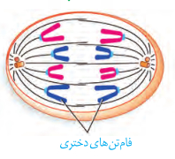 د- مشابه- به دنبال کوتاه شدن گروهی از رشتههای دوک، کروموزومهای دو کروماتیدی در قطبین یاخته قرار دارند.