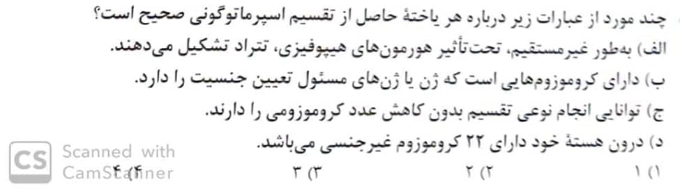 اسپرماتوسیت و اسپرماتوگونی حاصل این تقسیمات هستند.الف درمورد اسپرماتوگونی،ج درمورد اسپرماتوسیت اولیه و د برای هر دو غلط است.فقط ب صحیح است.