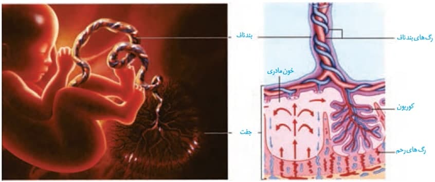 5-در بندناف جنین یک سیاهرگ با خون روشن وجود دارد و دو سرخرگ با خون تیره و قطری کمتر در اطزاف آن پیچیده اند.