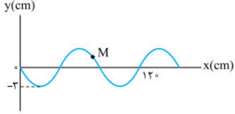 شکل روبرو نقش یک موج عرضی را در یک طناب در لحظۀ t=0s نشان می دهد که با سرعت 10 m/s در حال انتشار است . مسافتی که ذرۀ M در بازۀ زمانی t1=0.01s تا t2=0.05s طی می کند ، چند سانتی متر است ؟