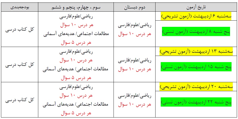 تاریخ برگزاری آزمون های هدیه برای آمادگی درامتحانات مدارس: