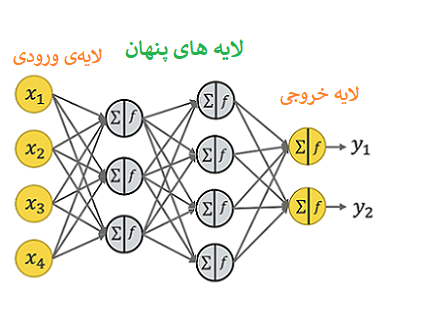 لایه های پنهان ، لایه های میانی و مخفی در شبکه های عصبی هستن که به طراحان این شبکه ها اجازه میدن تا داده های پیچیده رو با استفاده از نورون ها و اتصالات بین آنها، مدل سازی کنن. به جز شبکه ی عصبی پرسپترون ( که در حقیقت تنها یک نورون می باشد)، سایر شبکه های عصبی دارای حداقل یک لایه پنهان هستن. شبکه های با تعداد بالای لایه های پنهان ، به نام شبکه های عصبی عمیق و یا deep neural networks معروف هستند. رایج ترین نوع لایه های پنهان، لایه کامل متصل هست که در آن تمام نورون ها در هر لایه، به همدیگر متصل هستند. نحوه چیدمان لایه های پنهان در شبکه های عصبی، ما رو به انواع مختلفی از این شبکه ها میرسونه که شبکه عصبی پیشخور یکی از اوناست.