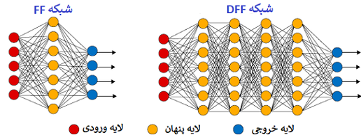 Deep Feed Forward Neural Networks یا به صورت مخفف ، DFF ، انواعی از شبکه های پیشخور هستند که به جای یک لایه ، از تعداد زیادی لایه های پنهان تشکیل شده اند. این شبکه ها از اوایل دهه 90 توسعه پیدا کرد و پس از اینکه نواقص اون برطرف شد، امروزه هسته مرکزی سیستم های یادگیری مدرن رو تشکیل میده . تصویر زیر دو شبکه عصبی پیشخور معمولی و پیشخور عمیق رو در کنار هم نشون میده .
