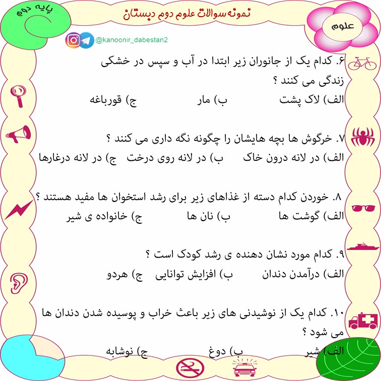 دانش آموزان عزیز سلامامیدواریم مثل همیشه حالتان خوب باشد و هر روز بیشتر از دیروز تلاش کرده و به موفقیت نزدیکتر شوید.در ادامه تصویر نمونه سوالات درس 3 تا 6 علوم دوم دبستان را برایتان گذاشته ایم.در اینستاگرام نیز با ما همراه باشید.