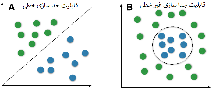 در شکل A میبینید که داده ها رو میشه با یک تفکیک کننده خطی جدا کرد، ولی در شکل B اینطوری نیست. اما این دایره هایی که در هر نمودار میبینیم چی هستند؟ این دایره ها همون داده های ما هستند. اگه یادتون باشه، گفتیم که در شبکه های عصبی، ماشین یک کلمه یا یک تصویر رو به بی نهایت نقطه و داده تقسیم میکنه.