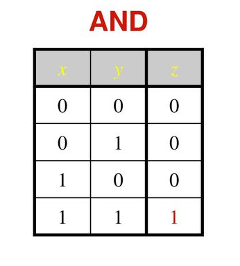 جدول این عمگر به صورت زیر هستش . این عملگر به گونه ای هست که اگه فقط یکی از دوتا ورودی ها، مقدار 0 رو داشته باشه، نتیجه 0 رو به خروجی میده. پس زمانی عمگلر AND خروجی 1 رو داره که هر دو ورودی 1 باشن ( یا هر دو ورودی فعال باشن).