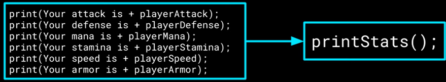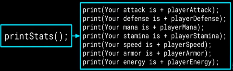 در پایان بحث از کارکردها اجازه بدید به یکی از مهمترین کاربردهای اونا اشاره کنیم. این کاربرد به ما کمک میکنه تا تغییرات بزرگی رو در کدمون ایجاد کنیم بدون اینکه همه اونها رو بررسی کرده باشیم. اجازه بدید به مثال printStatsمون برگردیم و فرض کنیم که میخوایید به این کارکرد برگردید و آمار جدیدی به اون اضافه کنید تا پلیر بتونه سطحش رو ارتقاء بده. بدون استفاده از کارکرد شما باید به کدتون برگردید و هر نمونهای رو که برای آمار یوزر نمایش دادید رو پیدا کنید و یه print statement جدیدی ایجاد کنید تا آمار جدید رو نمایش بده.