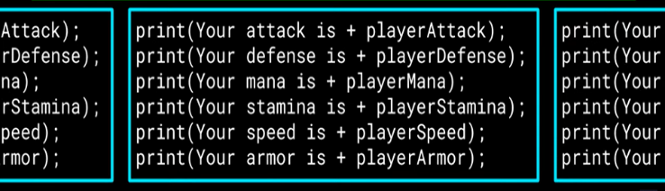 اما اگه یه کارکرد PrintStats ایجاد کنید، همه اون کاری که لازمه بکنید اینه که جایی رو که اون کارکرد رو تعریف میکنید پیدا کنید و یک Print statement اضافه کنید که آمار جدید رو نمایش میده و کار شما دیگه تمومه. حالا در هر جایی که PrintStats رو به کار بردید آمارهای جدیدی رو که وارد کردید نمایش میده.