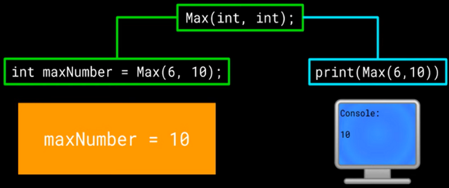 نکتهای که هنگام ساختن یک کارکرد باید بهش توجه کرد اینه که باید چیزی رو که کارکردتون قراره تولید کنه مشخص کنید، البته اگه اصلاً قراره چیز خاصی تولید کنه. کارکردها میتونن ارزشها رو به یوزر تحویل بدن. حالا میخواد این ارزش شکلی از متغیرهای رشتهای یا int ها یا حتی آرایهها (Arrays) باشه. چیزی که باید بهش توجه بکنیم اینه که در بازیابی متغیرها صرفاً انتخاب کارکرد کاری رو از پیش نمیبره. شما باید ارزش به دست اومده رو به چیزی تبدیل کنید یا اون رو print بکنید. به عنوان مثال Maxfunction که پیشتر در موردش صحبت کردیم یه int رو به یوزر تحویل میده. اما برای اینکه اون رو به درد بخور بکنیم یا باید یه متغیر عددی جدید خلق کنیم که برابر باشه با نتیجه Maxfunction مون، یا میتونیم حاصل کارکردمون رو نمایش بدیم که در این مورد حاصلِ ما بزرگترین ارزش بین دو عدد است.
