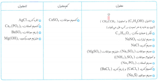 2- مواد نامحلول: موادی هستند که انحلال پذیری آن ها در دمای معین کم تر از 0/01 گرم در 100 گرم آب باشد. مانند کلسیم فسفات، نقره کلرید و باریم سولفات.