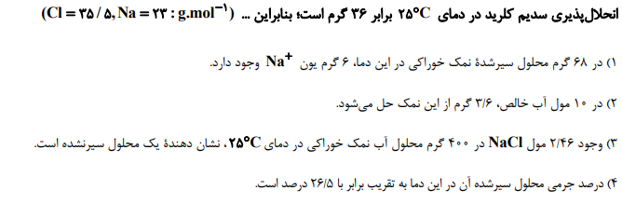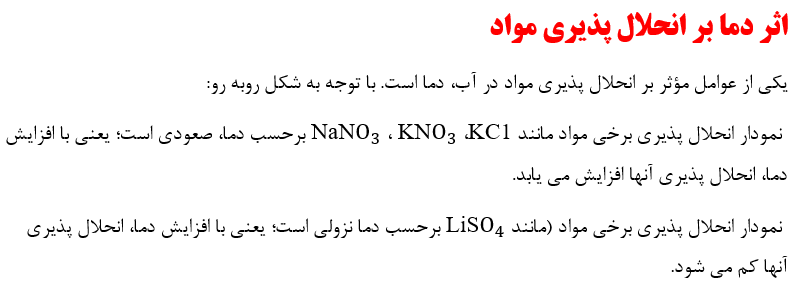 نکته: انحلال پذیری نمک ها به نوع آن ها و دما بستگی دارد، ولی تاثیر دما بر مقدار انحلال