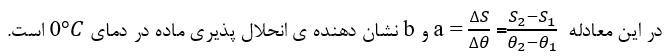 نکته: معادله ی خطی که رابطه ی بین انحلال پذیری و دما را نشان می دهد به شرح زیر است: S=aθ+b