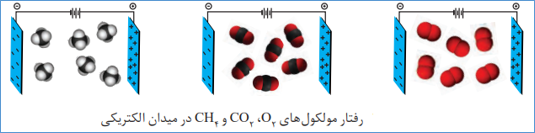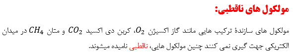 نحوۀ جهت گیری مولکول های آب در میدان الکتریکی نشان میدهد که اتم اکسیژن، سرِ منفی و اتمهای هیدروژن، سرِ مثبت مولکول را تشکیل می دهند. شیمیدان ها به مولکول هایی مانند آب که در میدان الکتریکی جهت گیری می کنند، مولکول های دوقطبی یا قطبی می گویند.