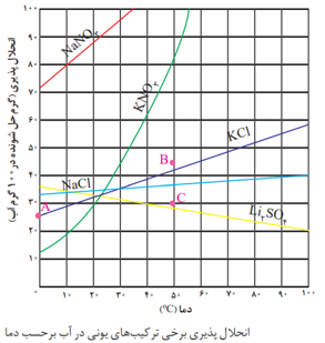 نکته: در این نمودار، نقاط روی منحنی نشان دهنده محلول سیر شده، نقاط زیر منحنی نشان دهنده محلول سیر نشده و نقاط بالای منحنی نشان دهنده محلول فراسیر شده است.