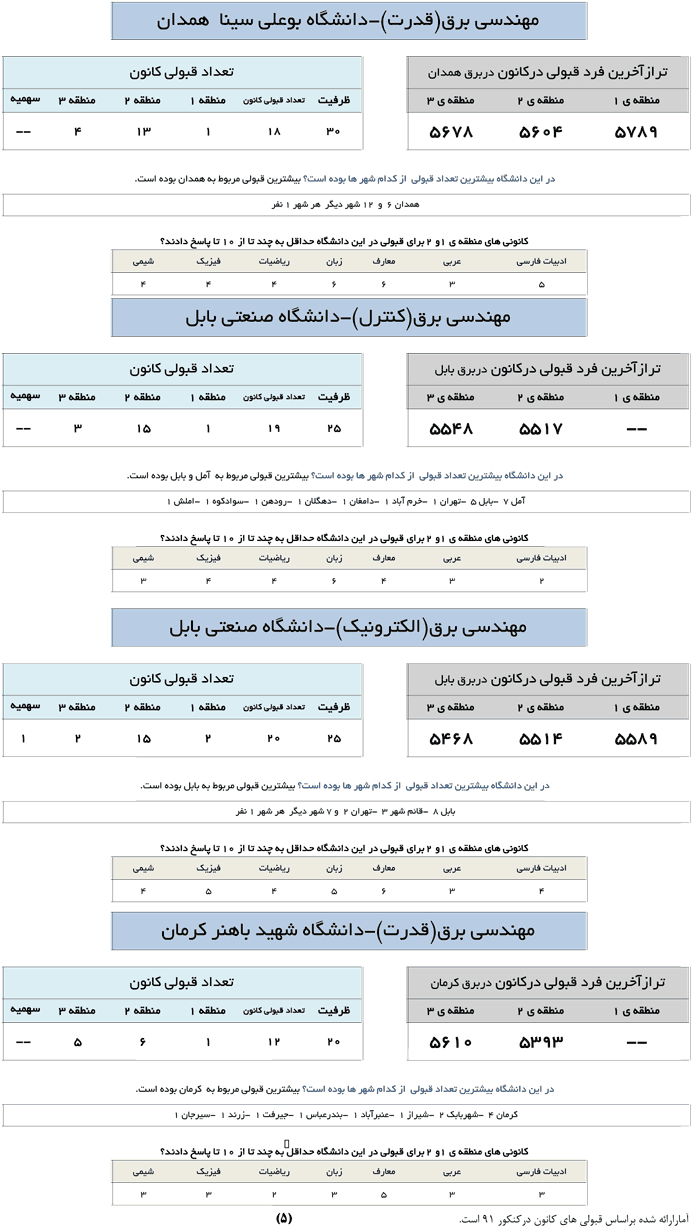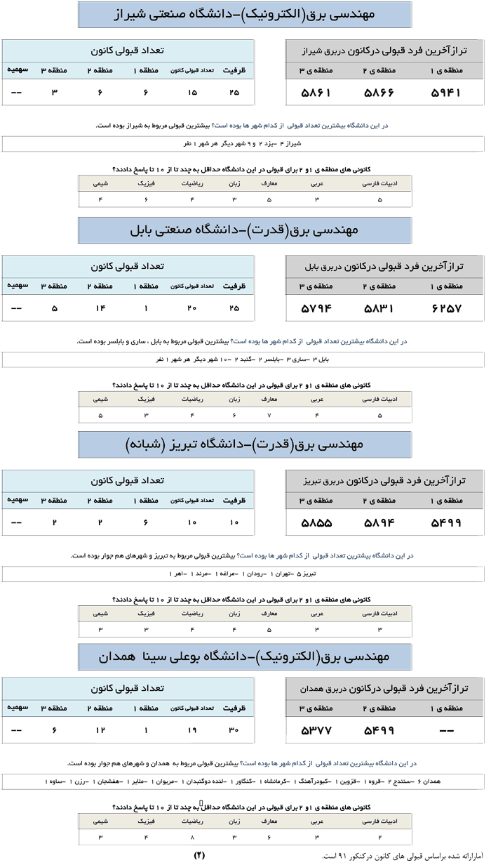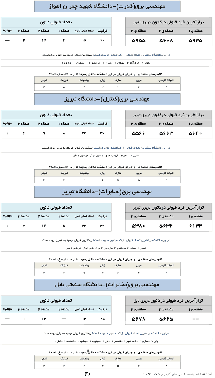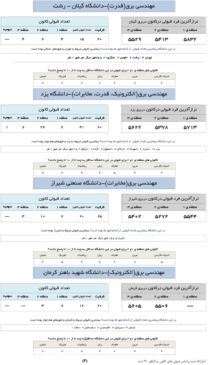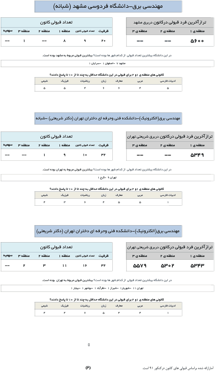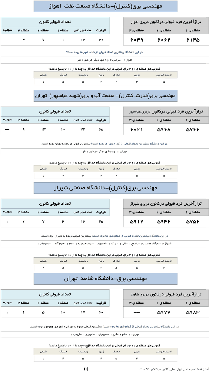 در جدول زیر تراز آخرین فرد قبول شده کانونی در رشته برق در دانشگاه های مختلف ارائه شده است.درگزارش قبلی تراز لازم برای ارائه شد.