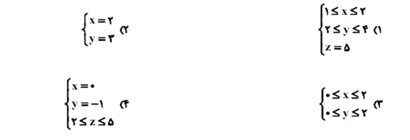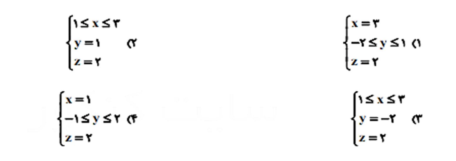 اگر A=(3,1,2) و C(1,-2,2) و B=(3,-2,2)و D=(1,1,2) رئوس وجه ABCD از یک مکعب مستطیل باشند، آن گاه کدام یک از معادلات زیر به هیچ کدام یک از یال های این مستطیل تعلق ندارد؟ ( آزمون کانون)