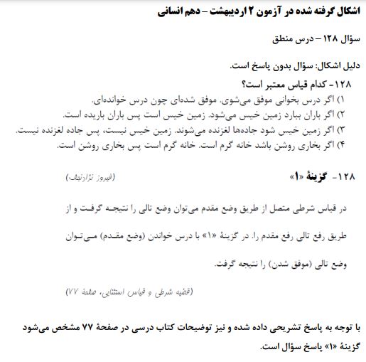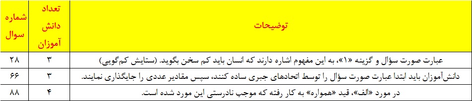 در صورتی که سوال را با گزینهها مطابقت دهیم ضمن بررسی واژهنامهٔ کتاب درسی متوجه خواهیم شد که سؤال به لحاظ علمی صحیح و فاقد ایراد است؛ بنابراین کلید و پاسخنامه تشریحی بهدرستی تنظیم شدهاست. صرفا از جهت نگارشی، کلمهای در صورت سوال اضافیست که این موضوع هم در نحوهٔ پاسخ به سؤال مؤثر نمیباشد و ایرادی بر وجهٔ علمی پرسش نمیتوان گرفت.